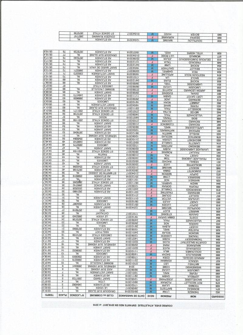 GUILLEUX Nora (M1F/82) / 5000m:20'13" , PELISSIER Benjamin (M1M/82) / 10000m:39'55" , DUPUY Mireille (M2F/77) / 5000m:22'08" , DUPUY Regis (M0M/89) / 10000m:34'30" , ROUGIER Helene (M3F/76) / 5000m:22'37" , BOIS Xavier (SEM/93) / 7195m:26'27"